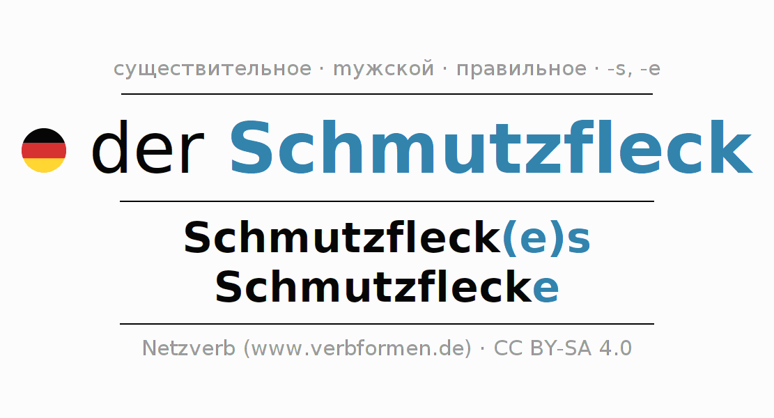 - Множественное число: die Schmutzflecke, der Schmutzflecke, den Schmutzflecken, die Schmutzflecke