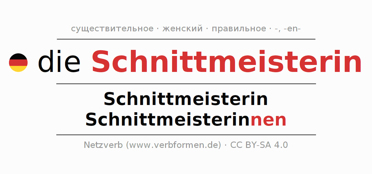 - Единственное число: die Schnittmeisterin, der Schnittmeisterin, der Schnittmeisterin, die Schnittmeisterin