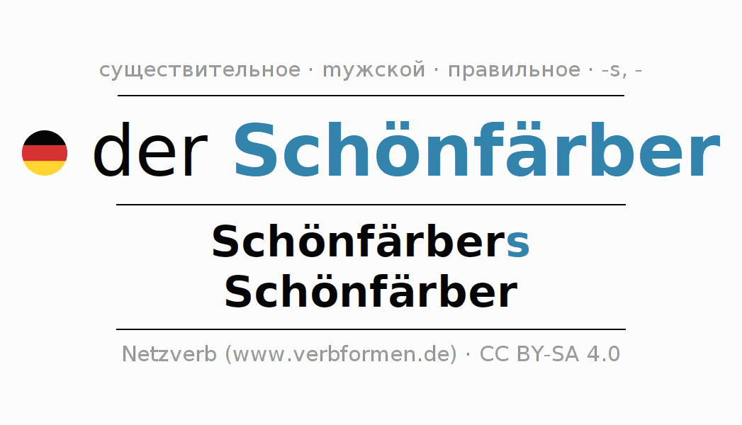 - Единственное число: der Schönfärber, des Schönfärbers, dem Schönfärber, den Schönfärber