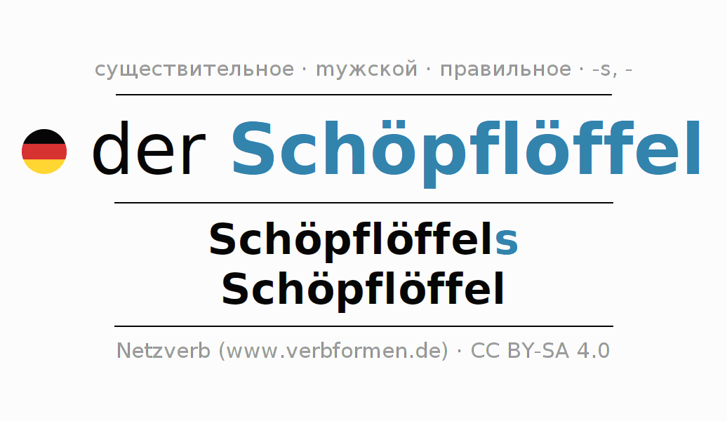 - Единственное число: der Schöpflöffel, des Schöpflöffels, dem Schöpflöffel, den Schöpflöffel