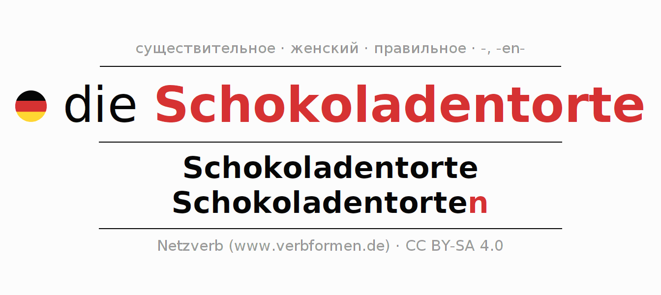 - Единственное число: die Schokoladentorte, der Schokoladentorte, der Schokoladentorte, die Schokoladentorte