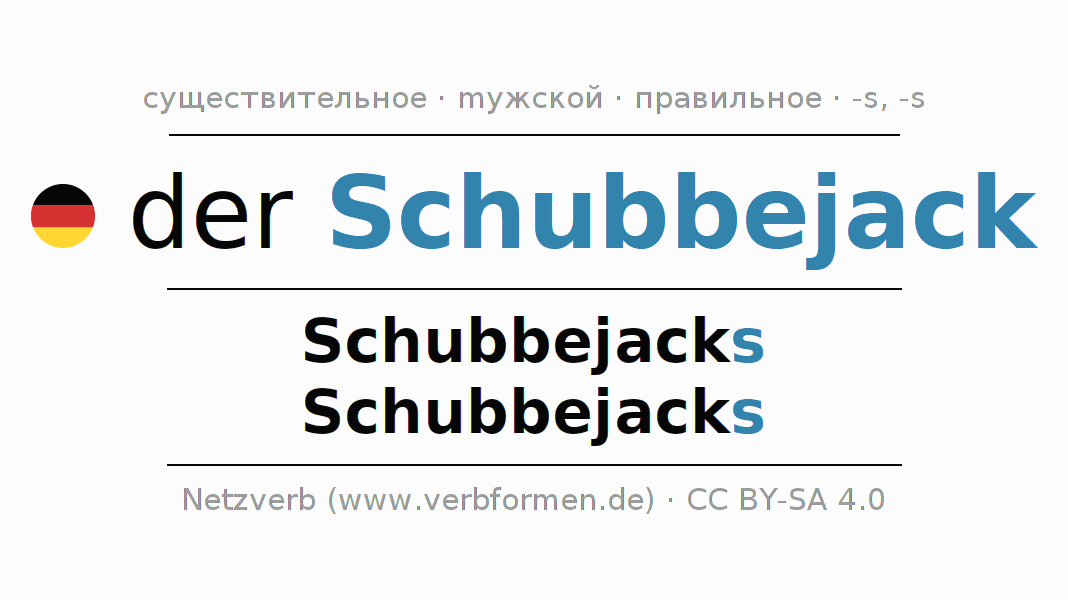 Склонение существительного Schubbejack даётся в родительном падеже единственного числаSchubbejacks и в именительном падеже множественного числа Schubbejacks. Существительное Schubbejack склоняется по сильному типу, получая окончания s/s. Может употребляться и с другими окончаниями. Грамматический род Schubbejack мужской с определённым артиклем "der" Здесь можно просклонять не только Schubbejack, но и все немецкие существительные. Kомментарии ☆