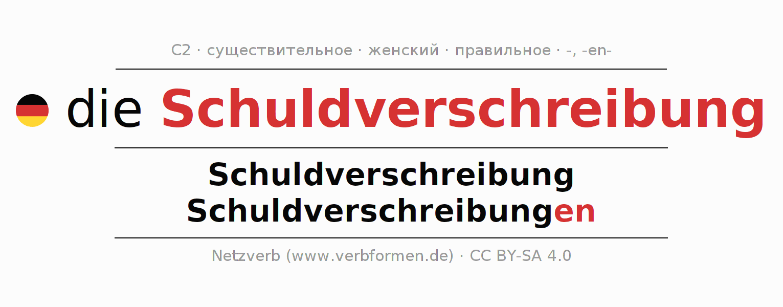 - Единственное число: die Schuldverschreibung, der Schuldverschreibung, der Schuldverschreibung, die Schuldverschreibung
