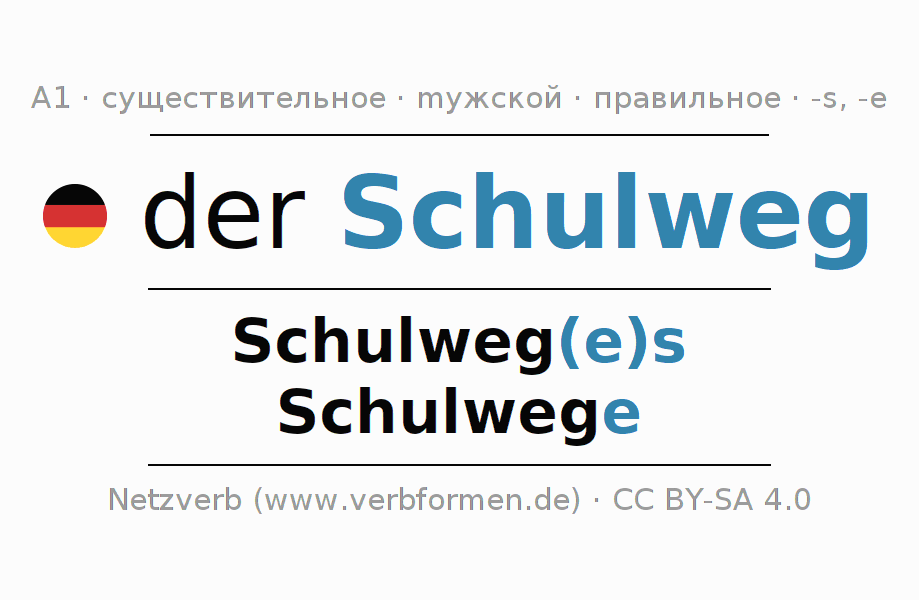 - Единственное число: der Schulweg, des Schulweg(e)s, dem Schulweg(e), den Schulweg