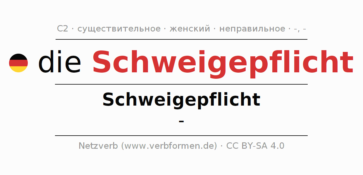 Склонение существительного Schweigepflicht (конфиденциа́льность, недопустимость разглашения) даётся в родительном падеже единственного числаSchweigepflicht и в именительном падеже множественного числа -. Существительное Schweigepflicht при склонении получает окончания -/-. Не образует форм множественного числа. Грамматический род Schweigepflicht женский с определённым артиклем "die" Здесь можно просклонять не только Schweigepflicht, но и все немецкие существительные. Существительное включён в словарный запас обладателя сертификата знания немецкого языка уровня C2. Kомментарии ☆