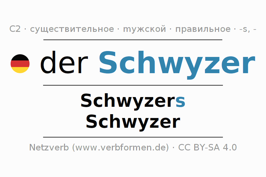 - Единственное число: der Schwyzer, des Schwyzers, dem Schwyzer, den Schwyzer