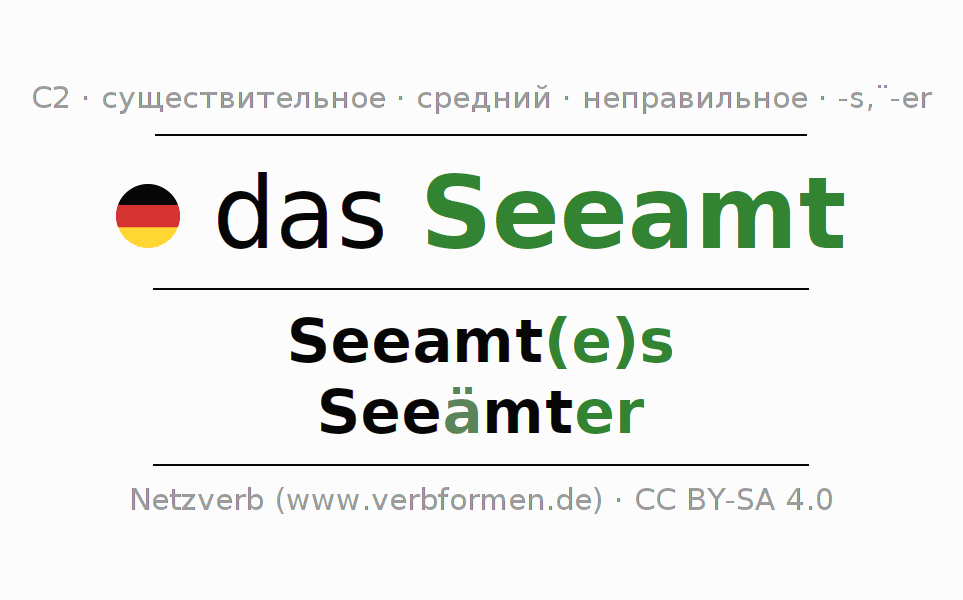 - Множественное число: die Seeämter, der Seeämter, den Seeämtern, die Seeämter