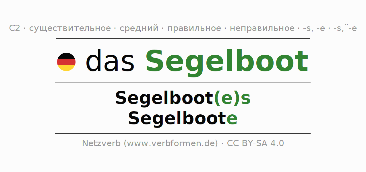 - Множественное число: die Segelboote, der Segelboote, den Segelbooten, die Segelboote