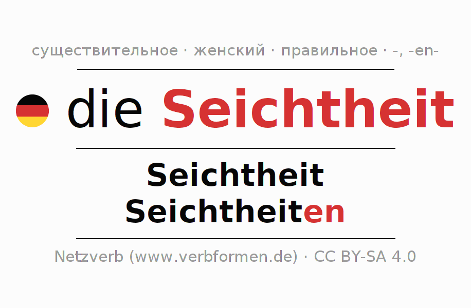 Склонение существительного Seichtheit (мелково́дье, мелкость) даётся в родительном падеже единственного числаSeichtheit и в именительном падеже множественного числа Seichtheiten. Существительное Seichtheit склоняется по слабому типу, получая окончания -/en. Грамматический род Seichtheit женский с определённым артиклем "die" Здесь можно просклонять не только Seichtheit, но и все немецкие существительные. Kомментарии ☆