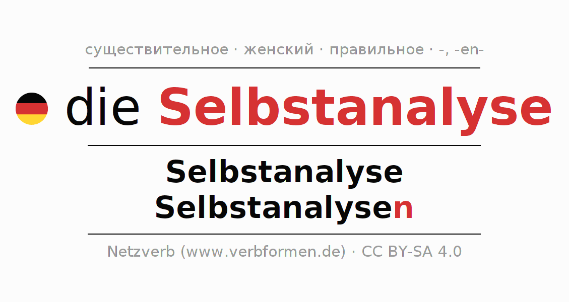 - Единственное число: die Selbstanalyse, der Selbstanalyse, der Selbstanalyse, die Selbstanalyse
