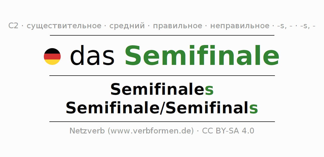 - Множественное число: die Semifinale/Semifinals, der Semifinale/Semifinals, den Semifinalen/Semifinals, die Semifinale/Semifinals