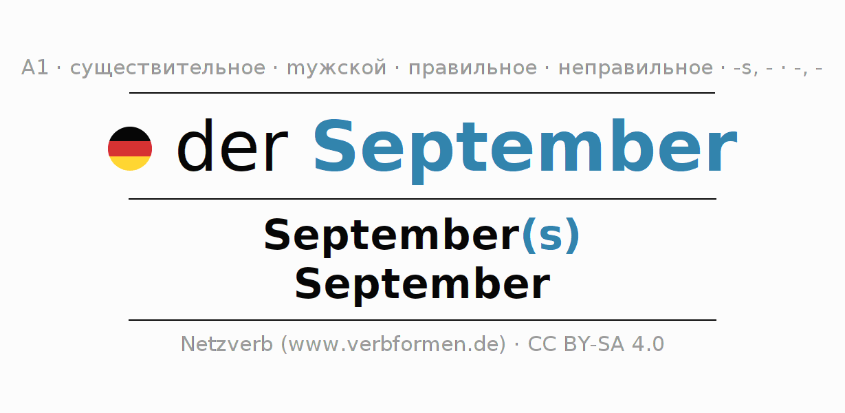 Склонение существительного September (сентябрь, сентя́брь) даётся в родительном падеже единственного числаSeptember(s) и в именительном падеже множественного числа September. Существительное September склоняется по сильному типу, получая окончания s/-/-. Грамматический род September мужской с определённым артиклем "der" Здесь можно просклонять не только September, но и все немецкие существительные. Существительное включён в словарный запас обладателя сертификата знания немецкого языка уровня A1. Kомментарии ☆