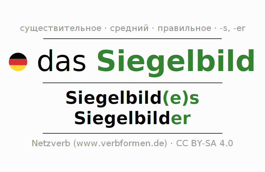 Склонение существительного Siegelbild даётся в родительном падеже единственного числаSiegelbild(e)s и в именительном падеже множественного числа Siegelbilder. Существительное Siegelbild склоняется по сильному типу, получая окончания es/er. Грамматический род Siegelbild средний с определённым артиклем "das" Здесь можно просклонять не только Siegelbild, но и все немецкие существительные. Kомментарии ☆