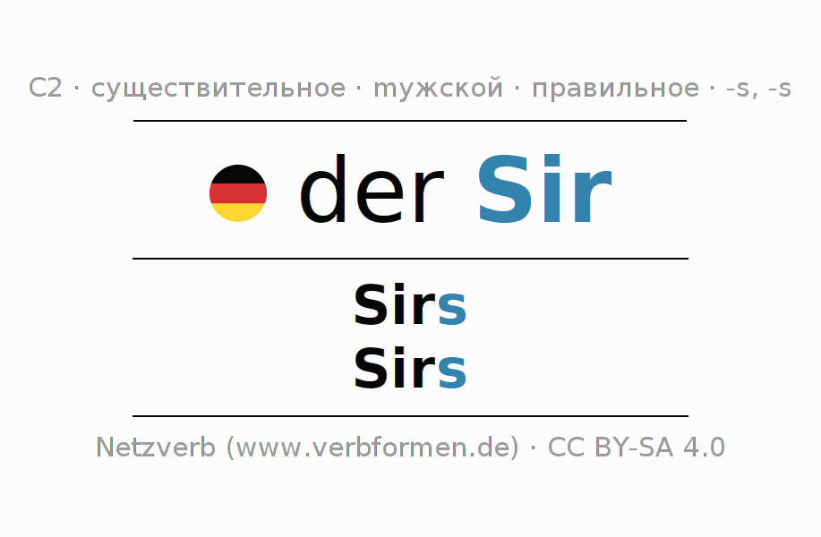 - Единственное число: der Sir, des Sirs, dem Sir, den Sir