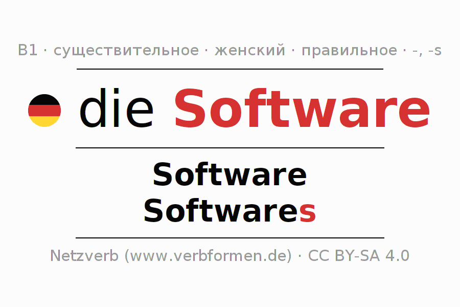 - Множественное число: die Softwares, der Softwares, den Softwares, die Softwares