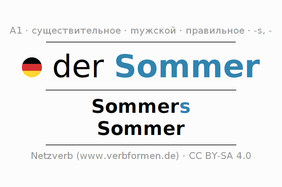 - Множественное число: die Sommer, der Sommer, den Sommern, die Sommer