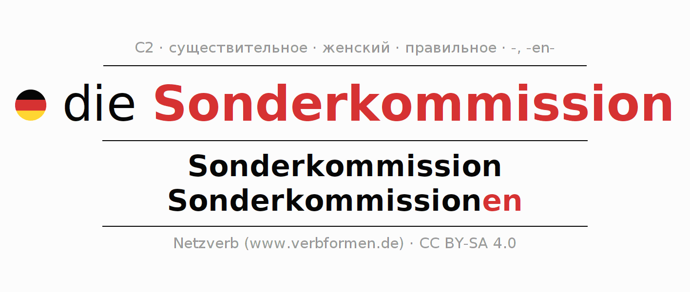 - Множественное число: die Sonderkommissionen, der Sonderkommissionen, den Sonderkommissionen, die Sonderkommissionen
