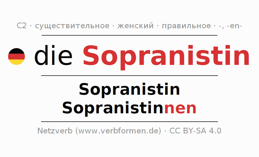 - Множественное число: die Sopranistinnen, der Sopranistinnen, den Sopranistinnen, die Sopranistinnen
