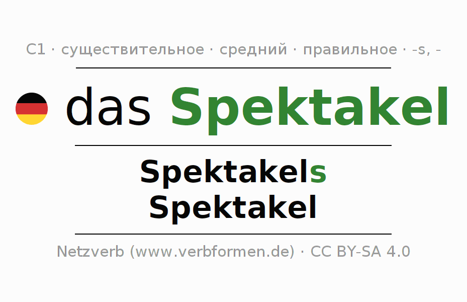 - Единственное число: das Spektakel, des Spektakels, dem Spektakel, das Spektakel
