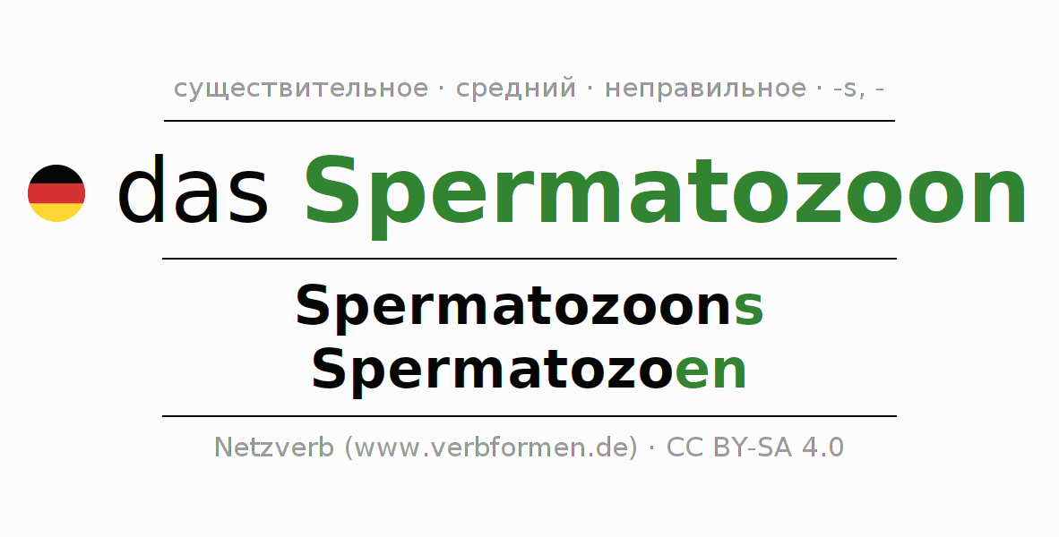 - Множественное число: die Spermatozoen, der Spermatozoen, den Spermatozoen, die Spermatozoen