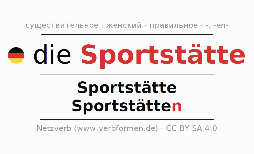 Склонение существительного Sportstätte (спорти́вная площа́дка, спорти́вное сооруже́ние) даётся в родительном падеже единственного числаSportstätte и в именительном падеже множественного числа Sportstätten. Существительное Sportstätte склоняется по слабому типу, получая окончания -/n. Грамматический род Sportstätte женский с определённым артиклем "die" Здесь можно просклонять не только Sportstätte, но и все немецкие существительные. Kомментарии ☆