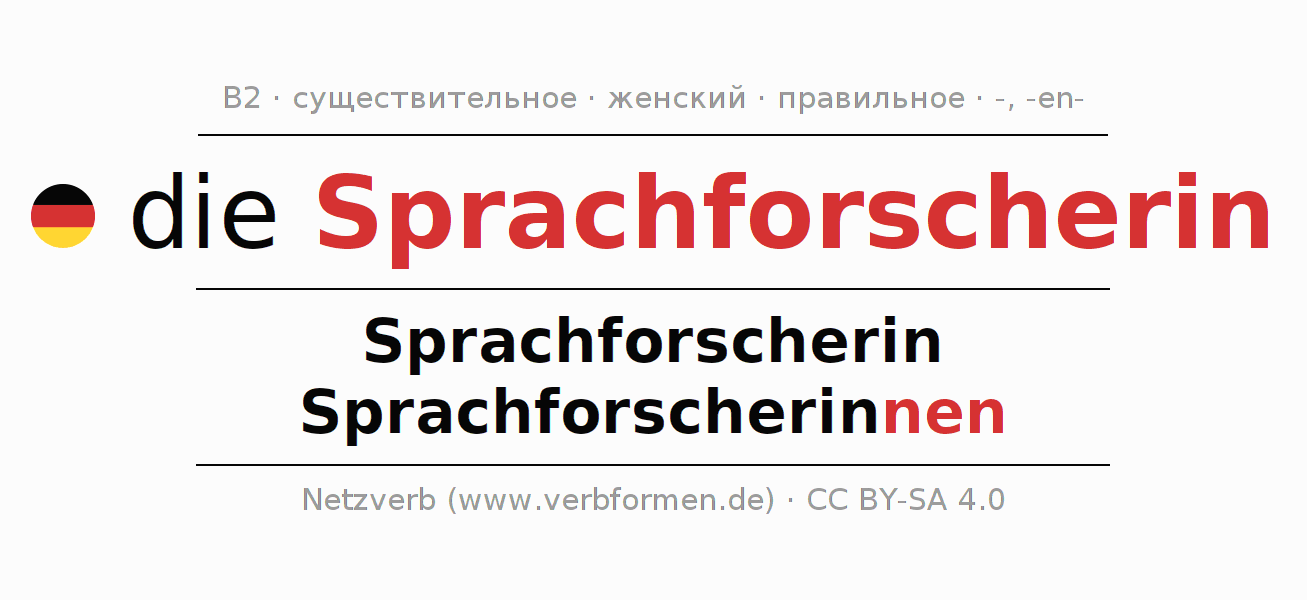 - Множественное число: die Sprachforscherinnen, der Sprachforscherinnen, den Sprachforscherinnen, die Sprachforscherinnen