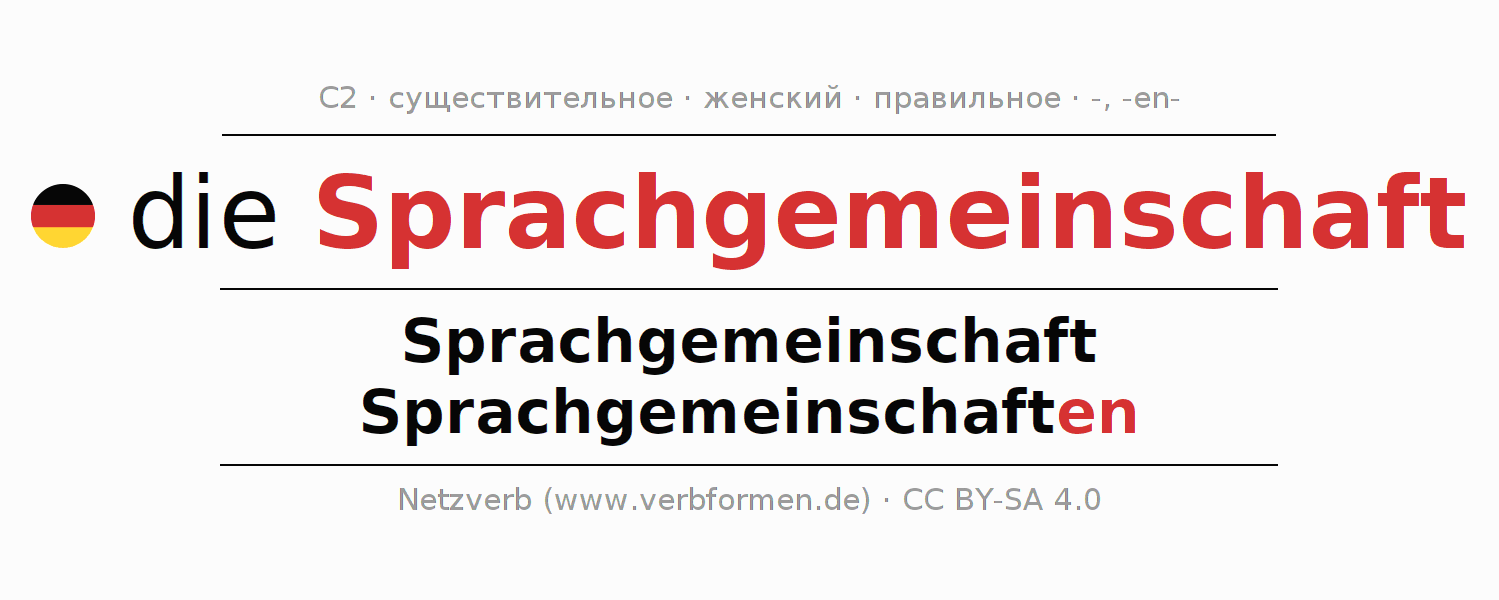 - Единственное число: die Sprachgemeinschaft, der Sprachgemeinschaft, der Sprachgemeinschaft, die Sprachgemeinschaft