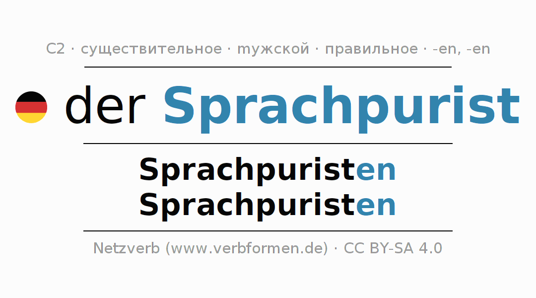 - Единственное число: der Sprachpurist, des Sprachpuristen, dem Sprachpuristen, den Sprachpuristen