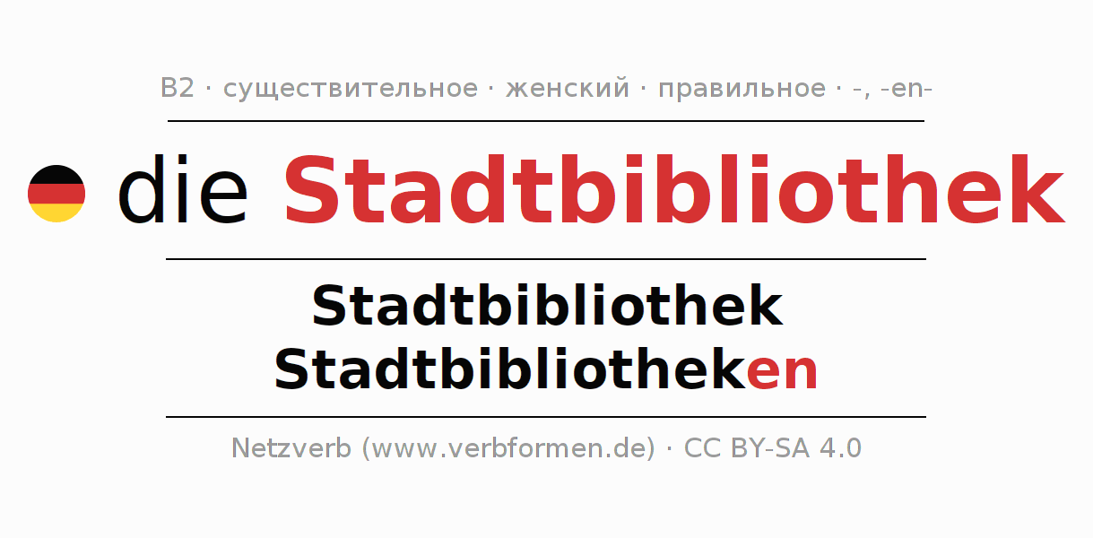 - Множественное число: die Stadtbibliotheken, der Stadtbibliotheken, den Stadtbibliotheken, die Stadtbibliotheken