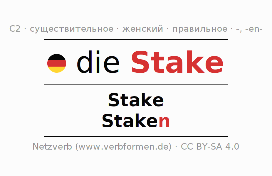 - Единственное число: die Stake, der Stake, der Stake, die Stake