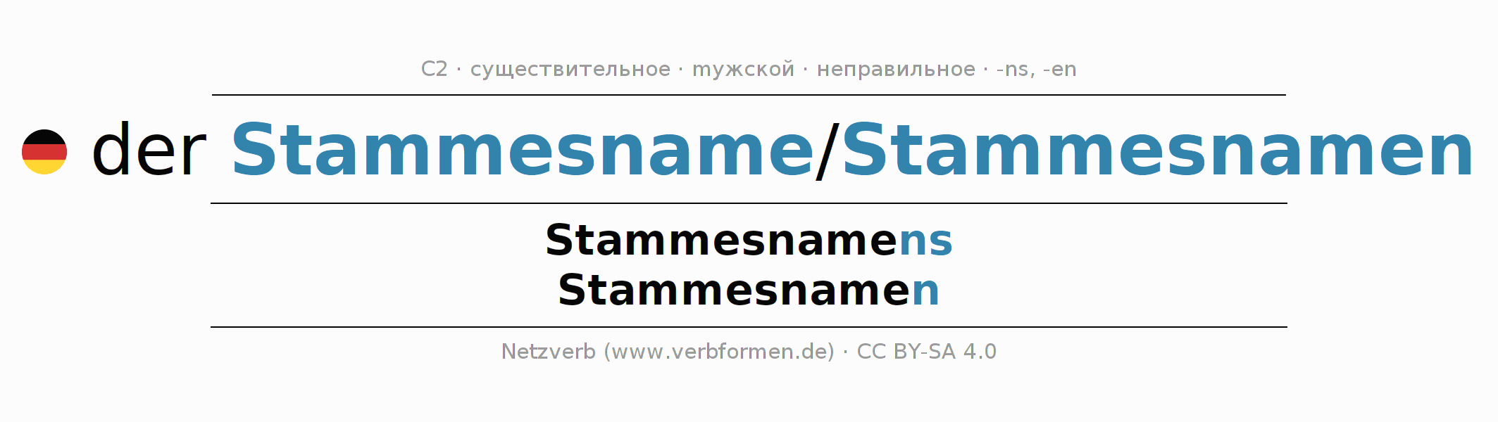 - Множественное число: die Stammesnamen, der Stammesnamen, den Stammesnamen, die Stammesnamen