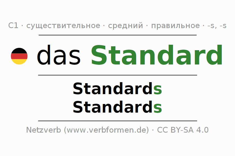 - Множественное число: die Standards, der Standards, den Standards, die Standards