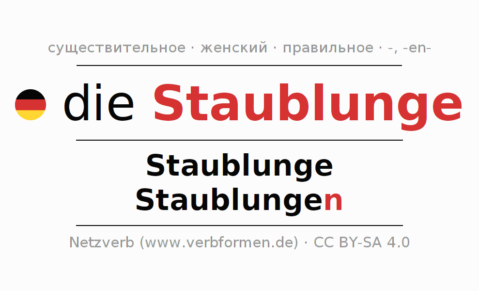 - Единственное число: die Staublunge, der Staublunge, der Staublunge, die Staublunge
