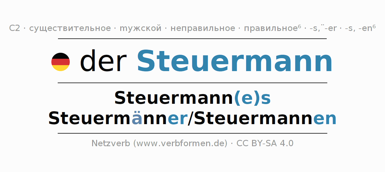 - Единственное число: der Steuermann, des Steuermann(e)s, dem Steuermann(e), den Steuermann