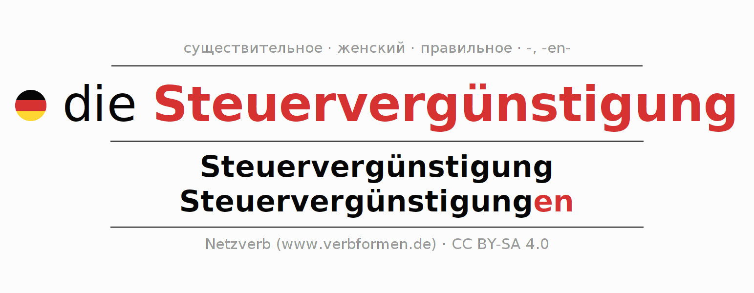 - Единственное число: die Steuervergünstigung, der Steuervergünstigung, der Steuervergünstigung, die Steuervergünstigung