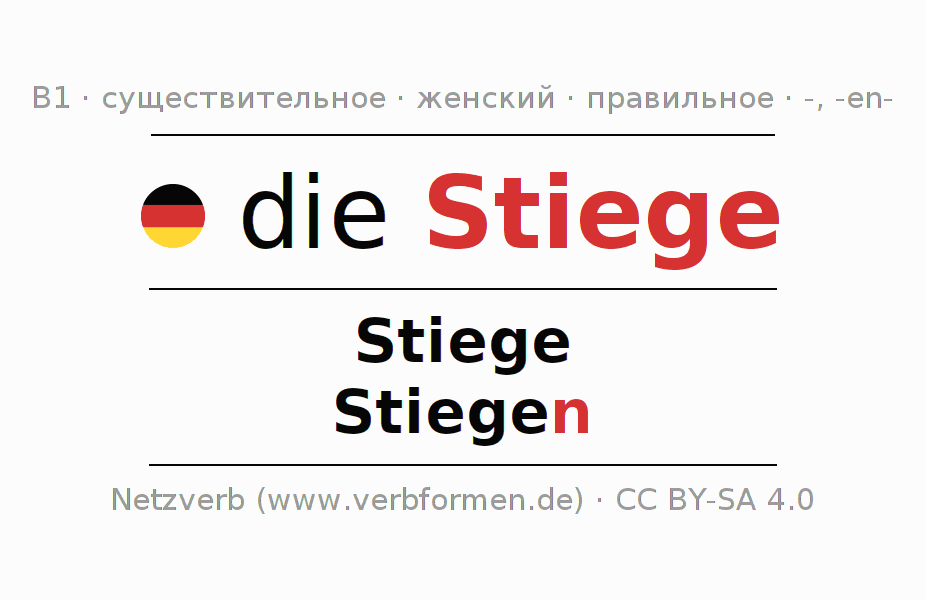 Склонение существительного Stiege (лестница, ле́стница) даётся в родительном падеже единственного числаStiege и в именительном падеже множественного числа Stiegen. Существительное Stiege склоняется по слабому типу, получая окончания -/n. Грамматический род Stiege женский с определённым артиклем "die" Здесь можно просклонять не только Stiege, но и все немецкие существительные. Существительное включён в словарный запас обладателя сертификата знания немецкого языка уровня B1. Kомментарии ☆