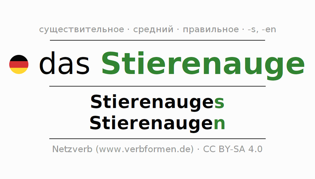 Склонение существительного Stierenauge даётся в родительном падеже единственного числаStierenauges и в именительном падеже множественного числа Stierenaugen. Существительное Stierenauge склоняется по смешанному типу, получая окончания s/n. Грамматический род Stierenauge средний с определённым артиклем "das" Здесь можно просклонять не только Stierenauge, но и все немецкие существительные. Kомментарии ☆