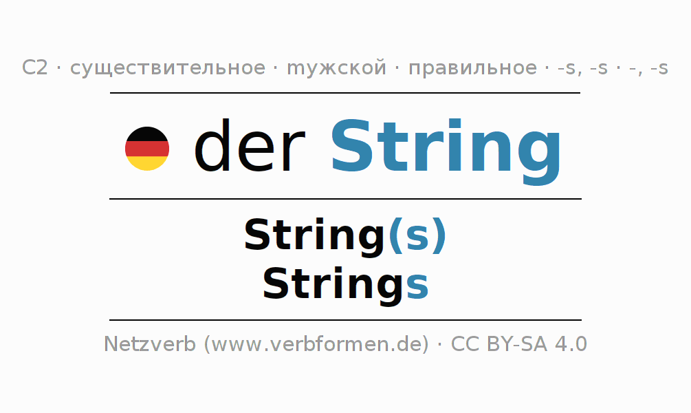 - Множественное число: die Strings, der Strings, den Strings, die Strings