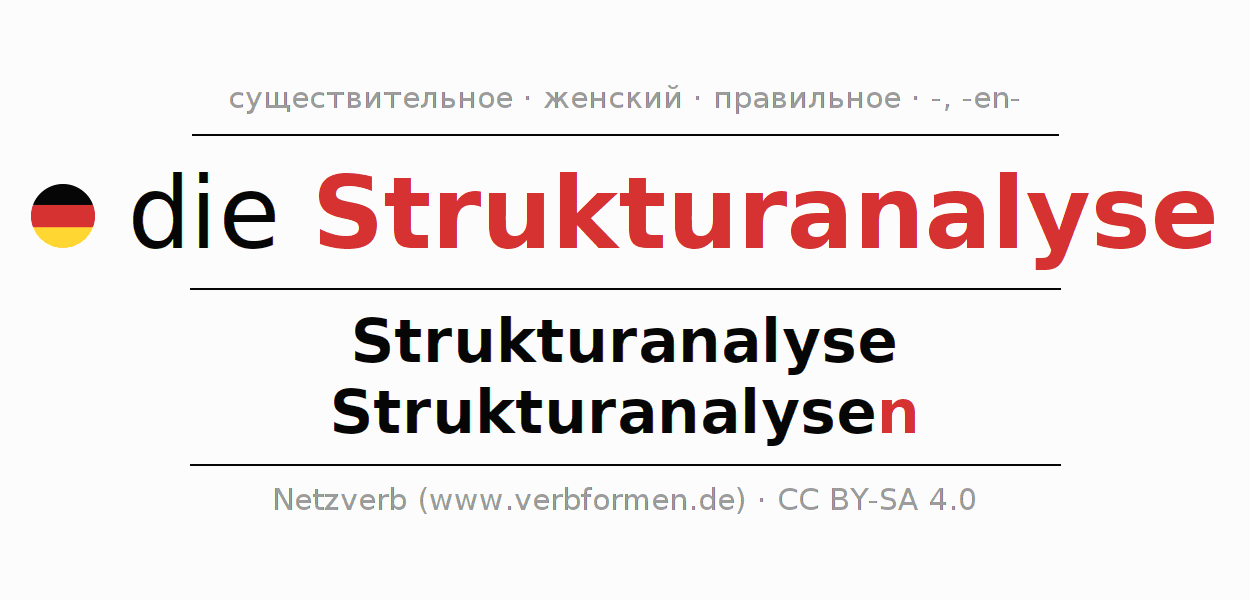 - Единственное число: die Strukturanalyse, der Strukturanalyse, der Strukturanalyse, die Strukturanalyse