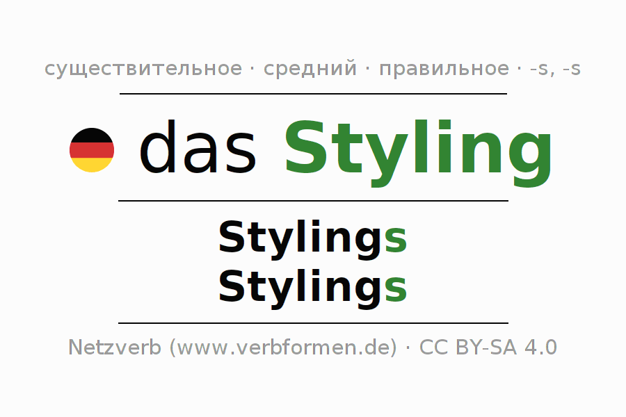 Склонение существительного Styling (диза́йн, оформле́ние) даётся в родительном падеже единственного числаStylings и в именительном падеже множественного числа Stylings. Существительное Styling склоняется по сильному типу, получая окончания s/s. Грамматический род Styling средний с определённым артиклем "das" Здесь можно просклонять не только Styling, но и все немецкие существительные. Kомментарии ☆