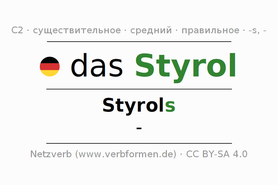 - Единственное число: das Styrol, des Styrols, dem Styrol, das Styrol