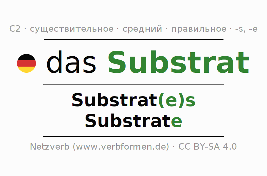 - Множественное число: die Substrate, der Substrate, den Substraten, die Substrate