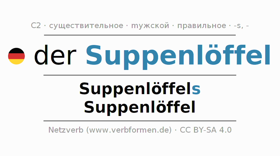 - Множественное число: die Suppenlöffel, der Suppenlöffel, den Suppenlöffeln, die Suppenlöffel
