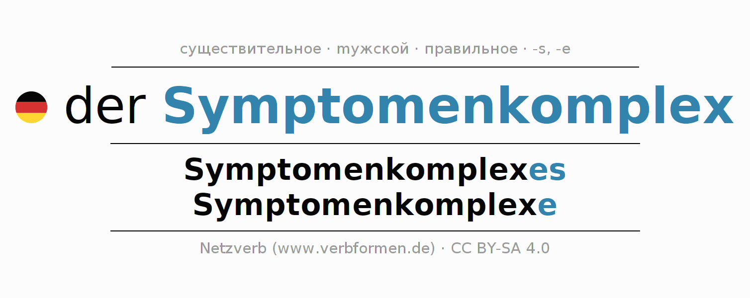 Склонение существительного Symptomenkomplex (комплекс симптомов) даётся в родительном падеже единственного числаSymptomenkomplexes и в именительном падеже множественного числа Symptomenkomplexe. Существительное Symptomenkomplex склоняется по сильному типу, получая окончания es/e. Грамматический род Symptomenkomplex мужской с определённым артиклем "der" Здесь можно просклонять не только Symptomenkomplex, но и все немецкие существительные. Kомментарии ☆