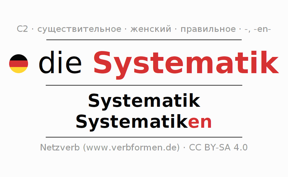- Единственное число: die Systematik, der Systematik, der Systematik, die Systematik