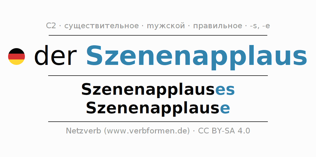 - Множественное число: die Szenenapplause, der Szenenapplause, den Szenenapplausen, die Szenenapplause
