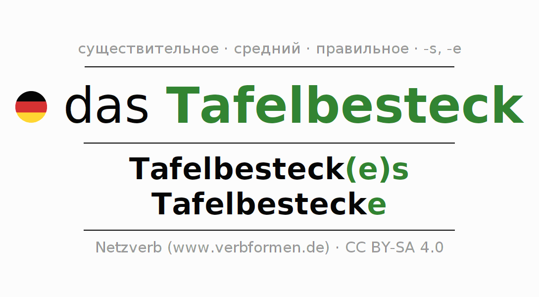 Склонение существительного Tafelbesteck (столовый прибор) даётся в родительном падеже единственного числаTafelbesteck(e)s и в именительном падеже множественного числа Tafelbestecke. Существительное Tafelbesteck склоняется по сильному типу, получая окончания es/e. Грамматический род Tafelbesteck средний с определённым артиклем "das" Здесь можно просклонять не только Tafelbesteck, но и все немецкие существительные. Kомментарии ☆