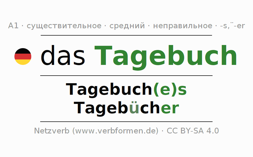 - Множественное число: die Tagebücher, der Tagebücher, den Tagebüchern, die Tagebücher