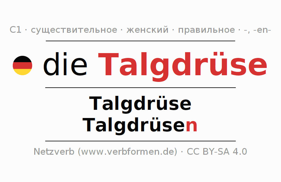 - Единственное число: die Talgdrüse, der Talgdrüse, der Talgdrüse, die Talgdrüse