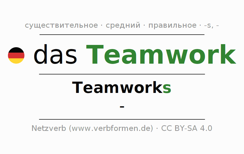 Склонение существительного Teamwork (коллекти́вная рабо́та, коллекти́вное достиже́ние) даётся в родительном падеже единственного числаTeamworks и в именительном падеже множественного числа -. Существительное Teamwork склоняется по сильному типу, получая окончания s/-. Не образует форм множественного числа. Грамматический род Teamwork средний с определённым артиклем "das" Здесь можно просклонять не только Teamwork, но и все немецкие существительные. Kомментарии ☆